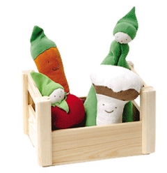 One lucky blog reader will win an Under the Nile veggie crate!  This is a wooden box (that smells really natural and nice) filled with soft, adorable organic cotton veggies: a mushroom, a tomato, a carrot and, our favorite, the green bean!  These veggies are great for sore teething gums, fun to snuggle with, and easy for crawlers to carry around the house with them.