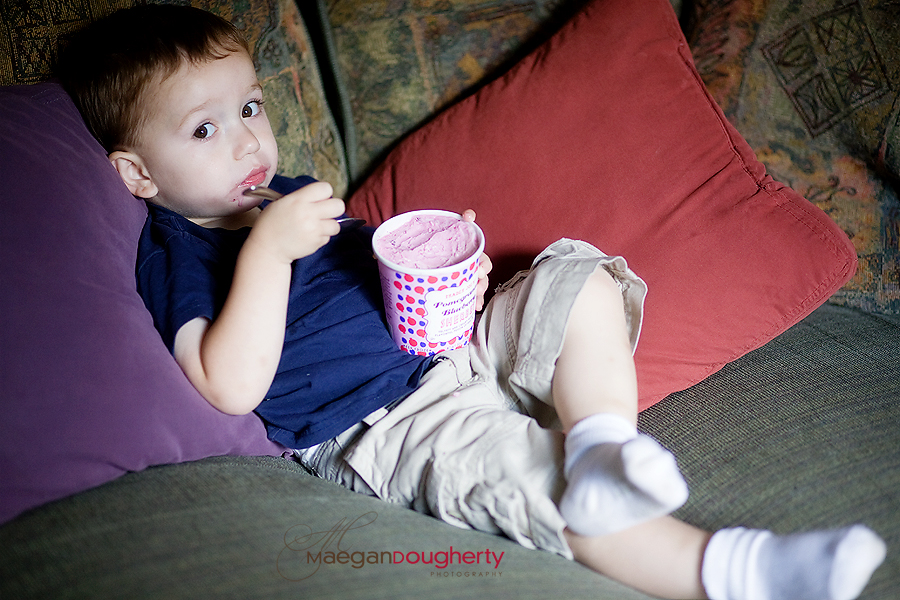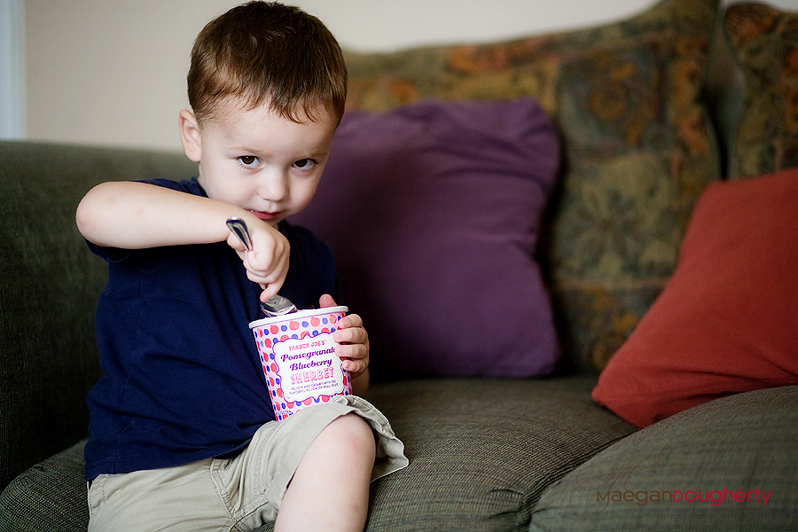 The other day Xander tried some Trader Joe’s Pomegranate Blueberry Sherbert and he looked so cute eating it. 🙂